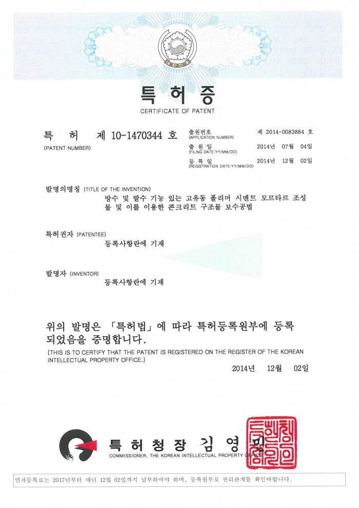 특허증 제10-1470344호 Smart-Seal공법 페이지 정보 글쓴이 관리자 조회 587 등록일 time18-01-12 15:53 댓글 0건 관련링크 이전글 다음글 목록 답변 본문 특허증 제10-1470344호 Smart-Seal공법 이전글 다음글 목록 답변