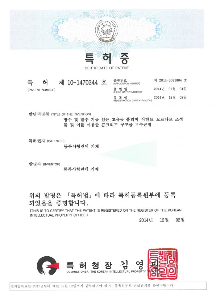특허증 제10-1470344호 방수 및 발수 기능 있는 고유동 폴리머 시멘트 모르타르 조성물 페이지 정보 글쓴이 관리자 조회 577 등록일 time18-01-12 15:54 댓글 0건 관련링크 이전글 다음글 목록 답변 본문 특허증 제10-1470344호 방수 및 발수 기능 있는 고유동 폴리머 시멘트 모르타르 조성물 이전글 다음글 목록 답변