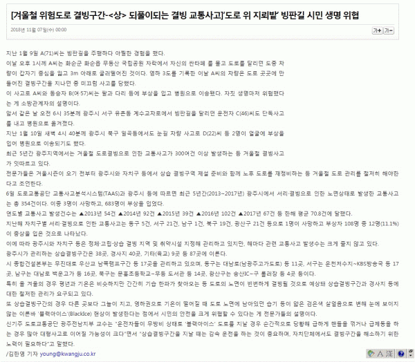 [겨울철 위험도로 결빙구간-<상> 되풀이되는 결빙 교통사고]`도로 위 지뢰밭`빙판길 시민 생명 위협 페이지 정보 작성자 dkeng 조회 2,410 등록일 time18-11-07 17:21 댓글 0건 관련링크 http://www.kwangju.co.kr/read.php3?aid=1541516400645501006&search=결빙 2055회 연결 이전글 다음글 목록 본문 [겨울철 위험도로 결빙구간-<상> 되풀이되는 결빙 교통사고]`도로 위 지뢰밭`빙판길 시민 생명 위협 이전글 다음글 목록